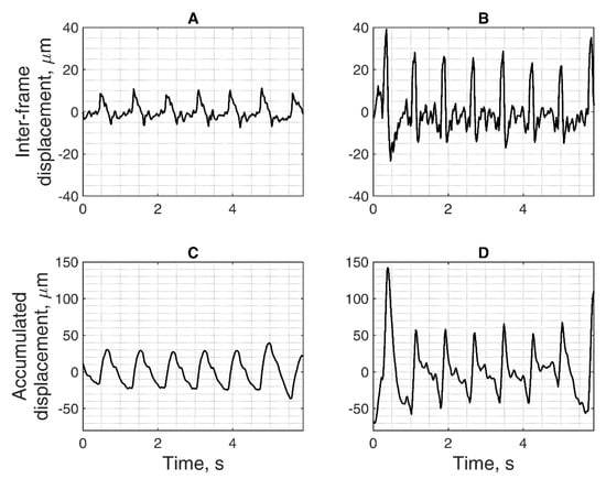 Location (space)-averaged displacements are a potentially useful tool for differential diagnosis of the brain regions. Here, we present an example of displacement-targeted assessment in the specific region of brain structure. For the case of Alzheimer’s disease, the hippocampus is the structure of interest for neurologists. The region of the hippocampus is outlined in Figure 7A. For this region, averaged displacement signal was calculated according to Equation (4). Region-averaged displacement signal is shown in Figure 8. Two forms of displacements are presented: the quantity of displacement detected at instances of a neighbouring B-scan frames, so-called inter-frame displacements (see Figure 8A,B), and another form of displacement in relation to a stationary positioned sonography transducer (see Figure 8C,D), calculated by integration (accumulation) of the inter-frame displacements.