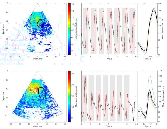 The obtained high beat-to-beat repeatability of the detected displacements can be hypothesized as a consequence of cardiovascular pulsations in intracranial structures. Those pulsations made it possible to estimate a confidence of displacement mapping in the presence of other disturbances. The intra-subject similarity of periodic displacement waveforms could be expressed by the normalized correlation coefficient, which was more than 0.8. The intra-subject similarity of periodic signal morphology was shown in the hippocampus ROI of the patient with Alzheimer’s disease and in the healthy elderly participant. The confident displacement amplitudes in the entire analyzed B-scan ranged from 8.3 µm to 162.5 µm for the patient with Alzheimer’s disease and from 30.6 µm to 263.2 µm for the healthy participant.