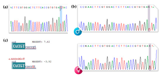 After classical sequencing of the ARSB gene, the presence of the novel c.1213+5G>T (IVS6+5G>T) variant was confirmed in homozygosity (Figure 1a). Apart from this novel variant of uncertain significance (VUS), only non-pathogenic single nucleotide polymorphism (SNPs) were detected.