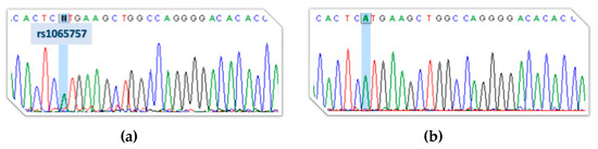 Indirect proof of principle on c.1213+5G>T [IVS6+5G>T] pathogenicity. Electropherograms highlighting the rs1065757 polymorphism (G>A) in the proband’s father (Pf) gDNA (heterozygous; (a)) and cDNA (homozygous A; (b)). The discrepant pattern observed for the exonic polymorphism (rs1065757, c.1072G>A) provides indirect proof of an active nonsense-mediated mRNA decay (NMD) mechanism causing the degradation of the allele harboring the splicing mutation.