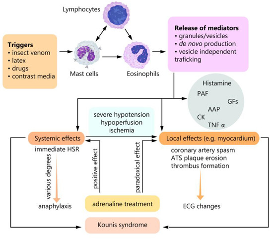 - Kounis, N.G.; Koniari, I.; Velissaris, D.; Tzanis, G.; Hahalis, G. Kounis Syndrome—not a Single-organ Arterial Disorder but a Multisystem and Multidisciplinary Disease. Balk. Med. J. 2019, 36, 212–221. [Google Scholar] [CrossRef] [PubMed]