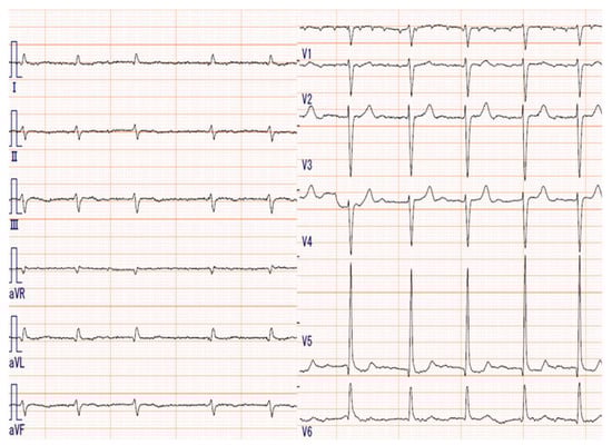 The electrocardiogram showing atrial fibrillation without any ST segmental elevation or depression.