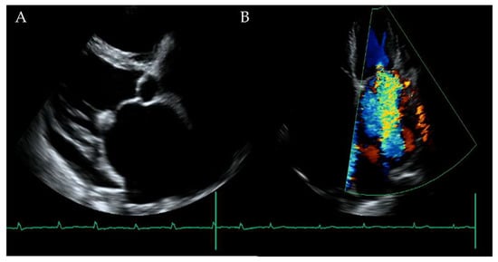 (A) The cardiac ultrasound showing preserved wall motion with severe left atrial dimension dilatation. (B) There was severe mitral regurgitation in addition to moderate tricuspid regurgitation.