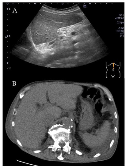Abdominal echogram (A) and computed tomography (B) showing chronic changes due to liver congestion.