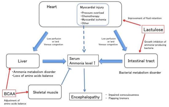 On the other hand, ammonia might be produced by myocardial injury due to heart failure and it may be an upstream stress that worsens the heart failure, which might be attenuated by ammonia-reducing treatments. The stress, from a variety of causes (pressure overload, chemotherapy, myocardial ischemia, or others), induces myocardial injury leading to increased ammonia production from the breakdown of cellular material [15], endoplasmic reticulum stress [16], and apoptosis [17] in heart tissues in a similar way with brain tissues [18,19]. Elevated concentrations of ammonia have been shown to enhance the production of free radicals and activate inflammatory pathways through NF-κB pathway [20]. The increased tissue ammonia might decrease cell function, hence, the removal of ammonia in cases of heart failure is also clinically valuable as the treatment of heart failure.
