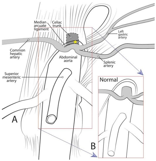 Median arcuate ligament syndrome (MALS), also known as celiac artery compression syndrome or Dunbar syndrome, is a rarely diagnosed disease resulting from compression of the celiac trunk (CT) by the median arcuate ligament (MAL) [] (Figure 1). The MAL is an arch-like fascial structure of the diaphragm linking the right and left diaphragmatic crura. While it has been noted as early as 1917 that the CT “is not infrequently partly covered by the diaphragm” [], the precise relationship of the CT to the MAL was not extensively studied until recent years [,,,,].