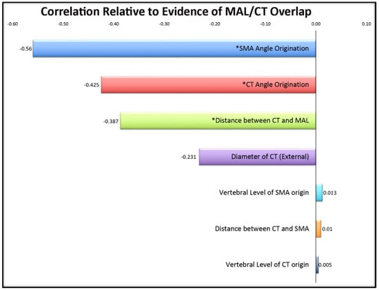 Correlations of cadaveric variables in relation to evidence of MAL/CT overlap. Significant values (p < 0.05) are denoted with an asterisk (*). Its significant negative correlation indicates that a smaller angle of origination suggests a greater likelihood of MAL/CT overlap.