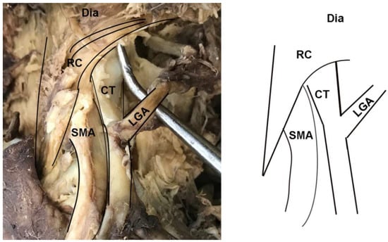 Dissection photo showing overlap of the celiac trunk by the right crus of the diaphragm: (left) Photo; (right) illustration. Abbreviations are as follows: CT = celiac trunk; Dia = diaphragm; LGA = left gastric artery; RC = right crus of diaphragm; SMA = superior mesenteric artery.