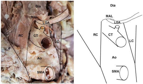- Katz-Summercorn, A.; Bridger, J. A cadaveric study of the anatomical variation of the origins of the celiac trunk and the superior mesenteric artery: A role in median arcuate ligament syndrome? Clin. Anat. 2013, 26, 971–974. [Google Scholar] [CrossRef]