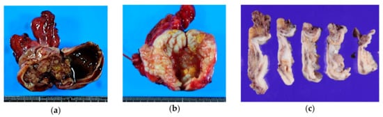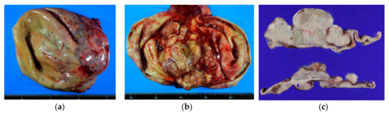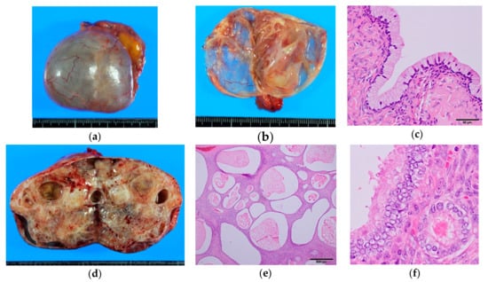 The average age of patients is 34–44 years. These tumors affect ovaries bilaterally in up to 40% of patients [9]; 30–50% are associated with endometriosis [7,10]. Grossly, they are unilocular or oligolocular cysts with papillary projections on the inner surface (Figure 2). The cyst wall is often fibrous and thickened. The mean size is 8–10 cm. Cyst content can be hemorrhagic, serous, or mucinous, and frequently mucopurulent, due to infiltration of neutrophils. Mural nodules, as seen in gastrointestinal-type MBT, is exceedingly rare in SMBT.