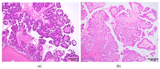 Seromucinous carcinoma (SMCA) is relatively rare; fewer than 40 cases have been described in the English literature, and no stage IV disease has been reported yet [20,21,22]. SMCA shares gross and microscopic features with SMBT (Figure 5), demonstrating papillary projections resembling those of SBT and admixture of several müllerian cell types, and shows high-grade cytologic atypia and architectural complexity. Cribriform and solid growth patterns are commonly seen, and patterns of stromal invasion are divided into expansile and are destructive as in mucinous carcinoma. The mitotic index varies but tends to be low, usually less than 5/10 HPF [5].