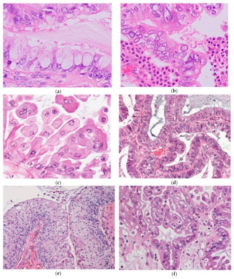 Seromucinous borderline tumor; microscopic pictures showing a variety of cell types. (a) Sometimes mucinous cells with voluminous cytoplasm can mimic goblet cells. Admixed lightly eosinophilic ciliated cells are almost always identifiable. (b) Background of prominent neutrophilic infiltration. Admixture of mucinous cells, eosinophilic cells, and some clear cells, with mild or moderate nuclear atypia and stratifications. (c) Indifferent cells with abundant eosinophilic cytoplasm. (d) Endometrioid type epithelium. (e) Squamous epithelium. (f) Clear cells. Focal hobnail appearance is also seen (right lower corner).