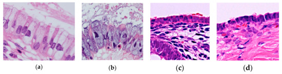 (a) Normal endocervical epithelium. (b) SMBT. (c) Normal surface endometrial epithelium of the uterus. (d) Serous cystadenoma. Scattered ciliated cells are admixed in all of the four epithelia. Notice the similarity between (a,b) and between (c,d), which are indistinguishable on hematoxylin-eosin stain.