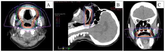 Computed tomography for carbon-ion dose distribution in initial mucosal melanoma. (A) Axial, (B) sagittal, and (C) coronal views. 70% dose: red-purple line, 50% dose: blue line, and purple line: 10%.