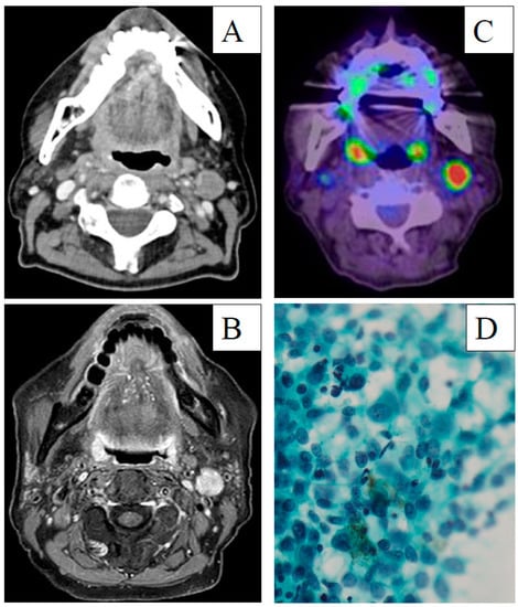 (A) Enhanced computed tomography image, (B) Magnetic resonance, (C) 18F-fluorodeoxyglucose positron emission tomography with computed tomography, imaged and (D) Papanicolaou staining of the metastatic lymph node. Scale bar = 100 µm.