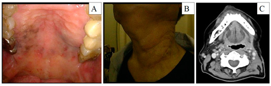 (A) White light images of the palate and (B) left neck and (C) enhanced computed tomography at 3 months after salvage neck dissection.