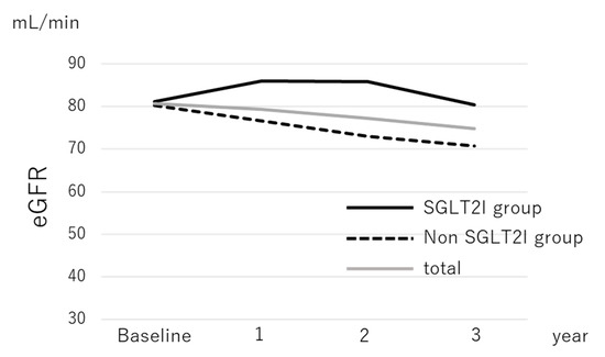 Nonalcoholic fatty liver disease (NAFLD) is the most common chronic liver disease in Japan, and it affects up to 25–30% of the general adult population worldwide [1]. NAFLD is known to be associated with extrahepatic diseases, such as type 2 diabetes mellitus (T2DM), cardiovascular (CV) disease and chronic kidney disease (CKD) [2,3,4]. The association between NAFLD and CKD has attracted considerable attention, and many studies support the concept that NAFLD affects the incidence of CKD [5,6]. Patients with NAFLD have a high risk of incident CKD, which is considered to be associated with the severity of the NAFLD. CKD is also one of the most common complications of T2DM. Thus, among patients with NAFLD, the presence of T2DM increases the risk of the development of CKD [7,8]. Currently, there are no established pharmacotherapies for NAFLD in patients with T2DM. However, antidiabetic agents, including pioglitazone [9,10] and glucagon-like peptide-1 (GLP-1) agonists [11], are expected to reduce hepatic fat content or hepatic inflammation in NAFLD. Several studies have reported the efficacy of sodium-glucose cotransporter-2 inhibitors (SGLT2I) in NAFLD with T2DM [12,13]. Patients with T2DM and high CV risk that received treatment with SGLT2I showed a slower progression of CKD and lower rates of renal events compared to patients receiving a placebo treatment [14,15]. There is a lack of longitudinal follow-up data regarding changes in renal function in NAFLD patients with T2DM. The renoprotective effect of SGLT2I in NAFLD remains unclear. This study aims to clarify the association between liver function and renal function in the follow-up period and the impact of SGLT2I treatment on renal function in NAFLD patients with T2DM.