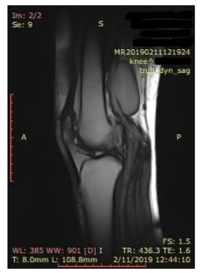 Magnetic resonance (MRI) of the knee, longitudinal axis view, showing the anatomy and location of the popliteal vein aneurysm.