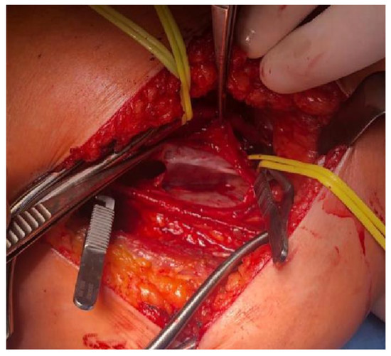 Intraoperative view after the isolation, incision and drainage of the popliteal vein aneurysm.