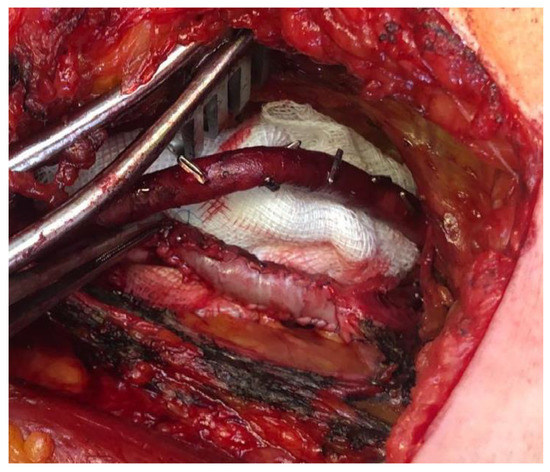 Tangential aneurysmectomy of the PVA and patch angioplasty with bovine pericardium.