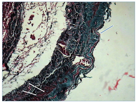 Microscopic examination with tricrom masson staining protocol showed continuous thinned venous layer with fragmentation of elastin fibres (blue arrow) and few smooth muscle fibers (white arrow) confirming the diagnosis of popliteal venous aneurysm (Figure 5).