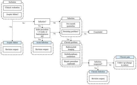 Following the algorithm, patients obtained either a diagnosis of acute infection, chronic infection, AF, or chronic pain. Acute infection was a clinical diagnosis, and joint aspiration was recommended. Diagnosis of AF and chronic infection were supported by clinical findings and RNI, joint aspiration, and bioptic procedures being optional. Chronic pain was a diagnosis reached by the exclusion of the aforementioned diagnoses (i.e., clinical suspicion not supporting AF or PJI and absence of ‘hot-spots’ by RNI and a bioptic procedure with a negative culture).