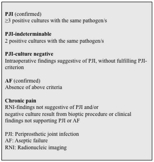 Joint aspiration was discouraged in the initial evaluation due to possible interference with RNI []. Following RNI, a recommendation was made for a diagnostic procedure or revision surgery. Invasive diagnostic procedures are a valuable option and should be employed when relevant. Despite using sterile techniques, concern exists for introducing infection in a sterile joint when employing invasive diagnostic procedures. Therefore, the decision-making process after evaluation of the chronic problem was left to the discretion of the surgeon and the patient. Hence, final diagnoses after RNI were made either by tissue culture (from a bioptic procedure or revision surgery) or a clinical follow-up, as reported by Aksoy et al. []. Details from RNI will be published elsewhere.