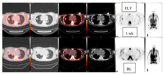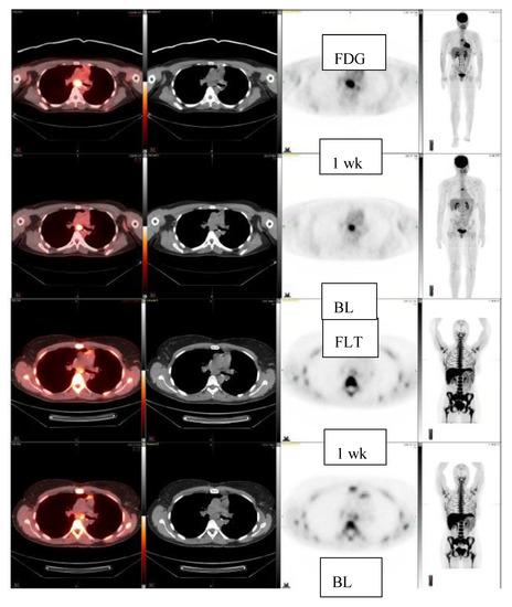 - Shields, A.F.; Grierson, J.R.; Dohmen, B.M.; Machulla, H.-J.; Stayanoff, J.C.; Lawhorn-Crews, J.M.; Obradovich, J.E.; Muzik, O.; Mangner, T.J. Imaging proliferation in vivo with [F-18]FLT and positron emission tomography. Nat. Med. 1998, 4, 1334–1336. [Google Scholar] [CrossRef] [PubMed]