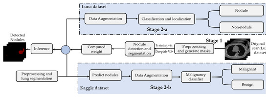 The block diagram of the proposed method. Stage 1 involves employing DeepLab-V3 plus for semantic segmentation. Stage 2-a involves the localization and the classification of nodules on LUNA16. Stage 2-b involves the detection and the classification of nodules on Kaggle’s dataset.