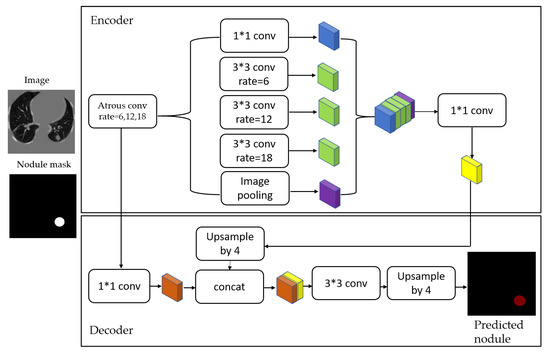 There has been an ever-growing body of research on automated detection of pulmonary nodules in medical images. Arguably, the literature can be divided into two families of algorithms: feature engineering-based methods and deep learning-based methods [3]. The literature of the former family of modules features a wide variety of lung segmentation and nodule detection techniques. The impact of different image preprocessing and postprocessing (false-positive reduction) methods was also extensively analyzed and discussed in the literature. On the other hand, deep learning-based methods have involved different N-D neural network structures, learning procedures, and data augmentation methods, in addition to others [4]. One of the promising deep network models in the recent literature, that has been adopted in various medical applications is DeepLab [5,6].