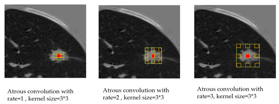 - Atrous convolution: Operates with space inside the filter that can take a large field of view, it is adaptively modified by varying the rate value [29,30] as in Figure 6. With a case of two-dimensional signals, atrous convolution is applied over the input feature map x as described in Equation (1) for each location i on the feature map output y and a convolution filter w:where the atrous rate r determines the stride with the sampled input signal, standard convolution is a particular case with .