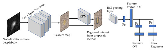 - Classification and bounding box regression: The proposals from the previous stage are classified by the mean of CNN and refined further to get the final ROI [37]. These stages are depicted in Figure 7.