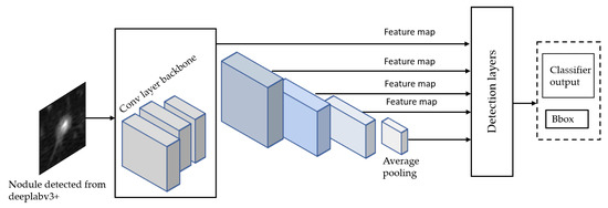 The SSD Single Shot Multibox Detector [35] is a recent object localization meta-architecture based on a bounding box regression principle. In comparison with the Faster R-CNN, it utilizes a single-stage feedforward for predicting anchor boxes and class scores for the objects in each box. Therefore, the anchors generated are much faster than other object localization models, making it more acceptable to mobile platforms with reduced hardware settings than computers. Finally, each region’s classification scores are calculated based on the score obtained in the previous step. For this model, we propose using Inception-V2 [36] as a base network to extract features and classify anchor boxes with all meta-architectures for the detection of ROI nodule as shown in Figure 8.