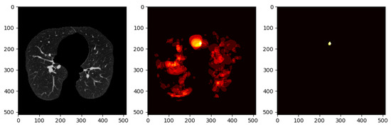 Left: raw CT scan. Middle: a patient’s heatmap generated from all the slices. Right: thresholded heat map to keep regions with multiple detections.