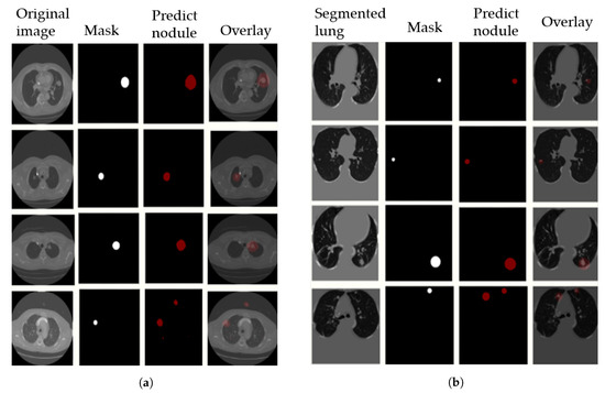 First, the images were resized to 512 × 512, and then converted to TFRecord to make the dataset compatible with the DeepLab code. Various options regarding network models were available, including MobileNet-V2 and Xception. Also, different hyperparameters are tunable, including the learning rate, the weighting of foreground and background, and the weight decay. In our experiments, the weights of the checkpoint used to segment the Pascal dataset were used as initial weights, with 0.0001 learning rate and foreground loss weight 100 for 50 K steps. In Figure 11, we visualize the output results on the LUNA16 validation set with segmented images (preprocessing step) in Figure 11a, and without preprocessing in Figure 11b. The 4th row in the figure shows some examples of false positive nodules.