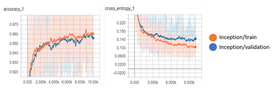 For the classification of the detected nodules from the Kaggle dataset, the results that are shown in Table 10 compares the Inception-V3 model with the MobileNet-V1 model. After 10,000 steps, we achieved the highest accuracy value of 96.05% and 95.66% for the training and validation accuracy, respectively, using the Inception-V3 model. The Inception-V3 model also achieved the lowest cross-entropy loss of 0.166 for the validation set. We show the variations of the accuracy and cross-entropy for that model in Figure 13. For MobileNet, the width multiplier = 1 and the resolution multiplier = 224 achieved an accuracy of 94% and 93% for training and validation, respectively, outperforming other parameter settings for MobileNet.
