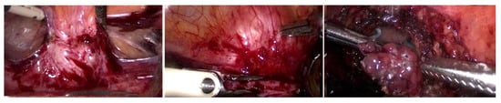 Figure 2. Urinary tract endometriosis—laparoscopic resection of a bladder endometriosis nodule infiltrating the bladder mucosa (personal collection, L. Pirtea).