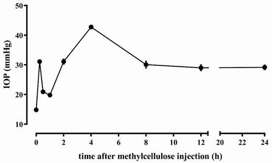 Time course of intraocular pressure progression in rats injected with 15 µL of 2% methylcellulose in the anterior chamber (n = 9 rats, 18 eyes).