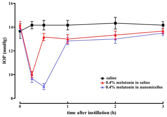 Here, we confirm previous findings demonstrating that melatoninergic agents exert hypotonizing effects on IOP [12,13,14,15,16,17]. The present findings also show that, when melatonin is formulated in nanomicelles, the duration of its effect is drastically increased, suggesting that melatoninergic agents administered in nanotechnology formulations can have longer lasting hypotonizing effects with respect to saline formulations whose efficacy is limited over time [12,14]. This would occur by enhancing compound bioavailability to eye tissues as the result of the mucoadhesiveness of the nanomicellar preparation, its larger cargo capacity, and the controlled drug release [27]. Although no nanomicellar formulations of melatonin have been used so far to increase melatonin delivery to the eye, there is evidence that formulations with liposomes, which represent an additional drug delivery system, increase the duration of the hypotonizing effect of the melatonin analogue methoxycarbonylamino-N-acetyltryptamine in the rabbit eye [28].