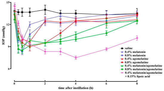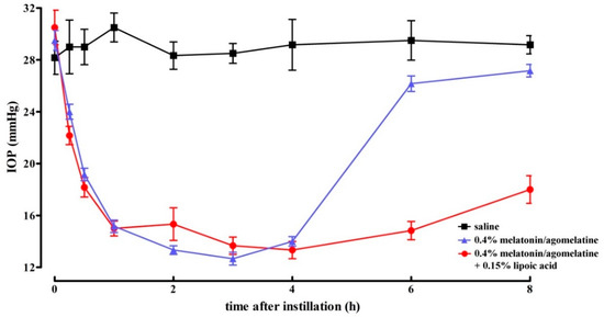 Melatonin is a neurohormone released during the dark period of the day not only by the pineal gland, but also by ocular structures including the retina, lens, iris, and ciliary body. In the eye, melatonin serves several functions; it exerts antiapoptotic and antioxidant activities and, in particular, decreases IOP, thus suggesting that melatonin or its analogues could be used to treat glaucoma [1]. In particular, topical application of saline formulations of melatonin or melatonin analogues such as methoxycarbonylamino-N-acetyltryptamine or agomelatine (commonly used as anti-depressant) [11] significantly reduces IOP [12,13,14]. Both melatonin and agomelatine have higher efficacy in reducing IOP in hypertensive than in normotensive eyes, suggesting that melatonin and its analogues can have a more effective hypotensive activity when hypertensive glaucoma is established [12,14]. In humans, oral melatonin is effective in reducing basal IOP in subjects with normotensive IOP and in patients undergoing cataract surgery [15,16], while oral agomelatine has been proven to reduce IOP in glaucoma patients [17]. Melatonin has also been demonstrated to exert neuroprotective effects in in vivo and in vitro models of retinal ganglion cell death induced by glutamate excitotoxicity [18], suggesting that melatoninergic agents can be used to reduce both ocular hypertension and degenerative processes in glaucomatous eyes. It is worth noting that melatonin is safe and well tolerated, even at high doses, and no adverse effects have been described indicating that melatonin could be an attractive pharmacological candidate to treat glaucoma [19]. However, the potential of melatonin-based therapies needs to be better evaluated. In addition, information about possible synergistic effects of melatonin with its analogues is still not available. The additional fact that melatonin acts as a potent free radical scavenger and antioxidant is indicative of the possibility that oxidative stress and reactive oxygen species can contribute to its degradation, thus limiting its half-life [20]. In this respect, the activity of melatonin can be potentiated by the addition of antioxidants among which lipoic acid is a fatty acid acting as a natural antioxidant that has been previously used to increase the antioxidant activity of melatonin [21]. Whether lipoic acid can influence the effect of melatonin or its analogues on IOP in glaucoma models has not been investigated so far. In this respect, lipoic acid, per se, does not influence IOP as demonstrated in a mouse model of spontaneously developed hypertensive glaucoma [22].