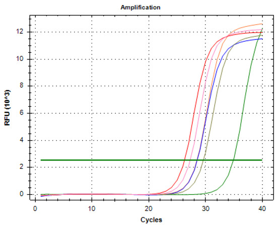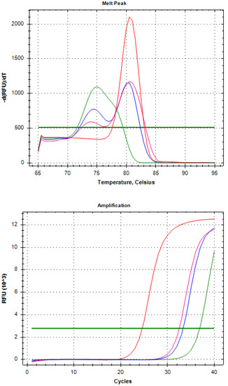 The red line in Figure 3 indicates the Vcap positive control, the green line indicates the Vcap 0 spike sample, the blue line indicates the Vcap 10 spike sample, and the pink line indicates the Vcap 100 spike sample.