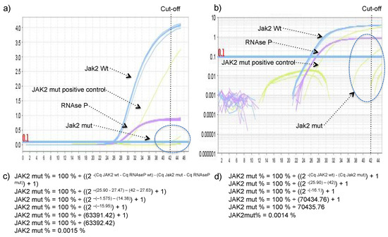 Depiction of Janus Kinase-2 (JAK2) wild type allele (blue), JAK2 mutant allele (yellow), and RNAse P (magenta) amplification curves in JAK2 V617F negative samples (n = 27) to illustrate the lack of amplification in most negative samples and the arbitrary established Cq cut-off value because one negative sample presented a Cq of 42: (a) Delta Rn in linear scale, (b) delta Rn in log scale. Examples of how raw data resulted in a particular mutant allele percentage: (c) Excepting RNAse P Cq, (d) including RNAse P in the calculation.
