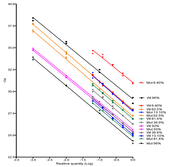 Linear regression depiction of JAK2 wild type allele (circles) and mutant allele (triangles) amplification when the proposed method was applied to 1:10 or 1:2 serial dilutions of DNA samples with distinct proportions of JAK2 mutant allele. We observed that both wt and mut standard curves were parallel (similar slopes) in all instances, satisfying the 2-ΔΔCq premises. Each point represents a technical replicate.