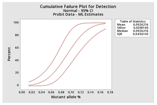 Probit regression analysis depicting the percentage of detection versus the JAK2 mutant allele (%). The LOD point is equal to the concentration at which 95% of the experiments gives a clearly positive signal.