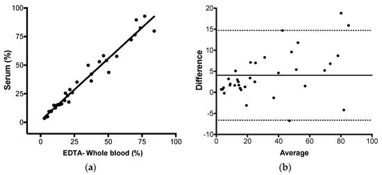 Comparison of JAK2 V617V mutant quantities in paired serum and EDTA-whole blood using 2-ΔΔCq method. (a) Linear regression (R2 of 0.965). (b) Bland–Altman analysis (Bias of 4.058% (solid line) with 95% CI −6.6% to 14.7% (dashed lines)). Thirty-five positive samples with known results were included in this analysis.