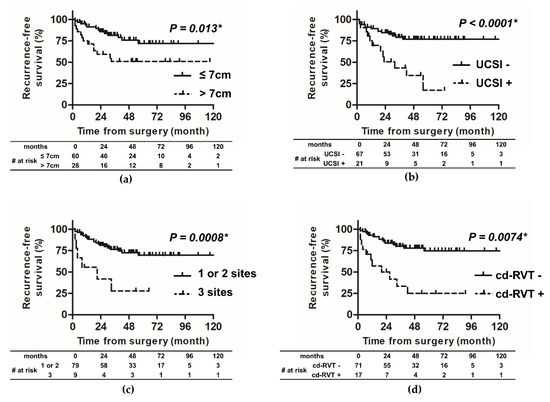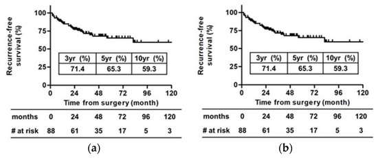 For statistical analysis, the survival intervals were calculated from the date of surgery to the date of first diagnosis of metastasis (recurrence-free survival (RFS)), the date of death from cancer (CSS), or the last follow-up. Statistical analyses were performed using SPSS for Windows (version 20.0; IBM, Corp., Armonk, NY, USA). Figures were generated using GraphPad Prism 5.0 (GraphPad Software, Inc., La Jolla, CA, USA). RFS and CSS were estimated using the Kaplan–Meier method and the log-rank test was applied to compare survival curves. The univariate and multivariate Cox proportional-hazards regression models were used to identify the predictors of recurrence. A p-value < 0.05 was considered statistically significant.