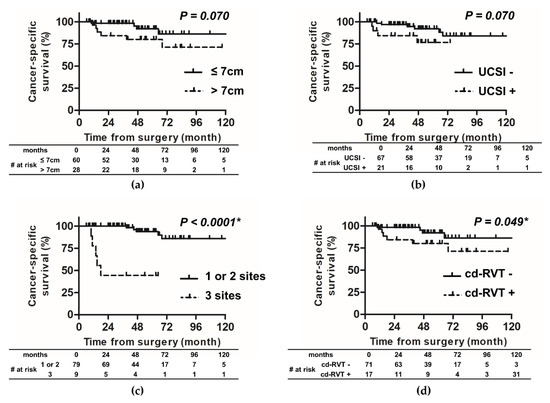 Similarly, for CSS, the univariate analysis showed that there was a statistically significant difference between patients with one or two invasive sites and those with three invasive sites, and the five-year CSS rate was 93.8% and 44.4%, respectively (HR NA, p < 0.0001, Figure 4c), as well as between patients with and without cd-RVT, and the five-year CSS rate was 70.5% and 92.6%, respectively (HR 5.08, p = 0.049, Figure 4d). However, there was no statistically significant difference in CSS between patients in terms of tumor size (HR 3.25, p = 0.07, Figure 4a) and the presence of USCI (HR 4.35, p = 0.07, Figure 4b). However, patients with tumor size > 7 cm or with USCI showed a tendency to have poor CSS. This could be due to the small sample size or the short observation period. In this study, of the 91 patients, only 10 patients died due to RCC. In the univariate analysis, gender, age, CRP, Fuhrman grade, INF, LVI, necrosis, histological classification, sarcomatoid variant, PFI, and SFI showed no significant difference in predicting CSS (Table 3). We do not show the results of multivariate analysis for CSS because there are few cases of cancer death.