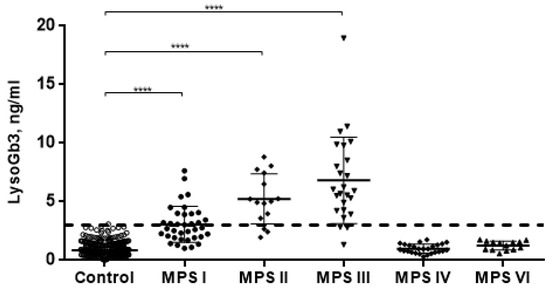 LysoGb3 concentration in normal controls and patients with different types of mucopolysaccharidoses (MPSs) (dotted line-cut-off for LysoGb3 level). **** p < 0.0001.