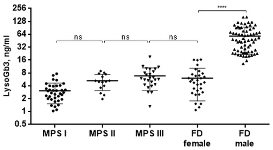 Therefore, we compared LysoGb3 concentration in untreated MPS patients and Fabry disease (FD) patients (male n = 68 and female n = 31) for whom this metabolite is a diagnostic marker (Figure 2). The LysoGb3 concentration in patients with untreated MPSs is comparable to the concentration of LysoGb3 in FD females (6.91 ± 6.07 ng/mL) but significantly lower compared to FD males (57.70 ± 36.18 ng/mL).