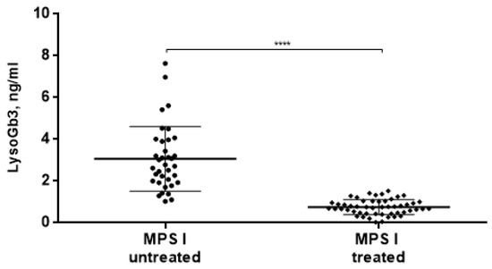 Moreover, we found that in MPS I patients who had been receiving ERT, the concentration of LysoGb3 significantly decreases (0.75 ± 0.36 ng/mL) compared to MPS I patients without ERT (3.07 ± 1.55 ng/mL) (Figure 3).